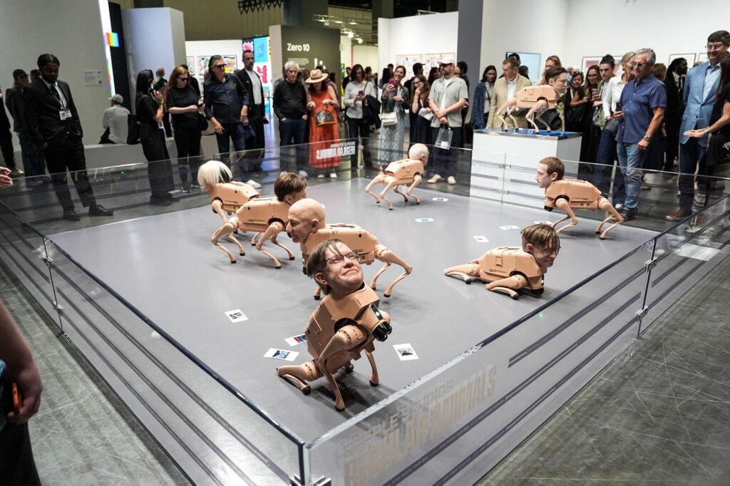 Los perros-robot con cabezas hiperrealistas —entre ellos un “Musk robótico”— fueron el fenómeno digital más viral de Art Basel 2025.