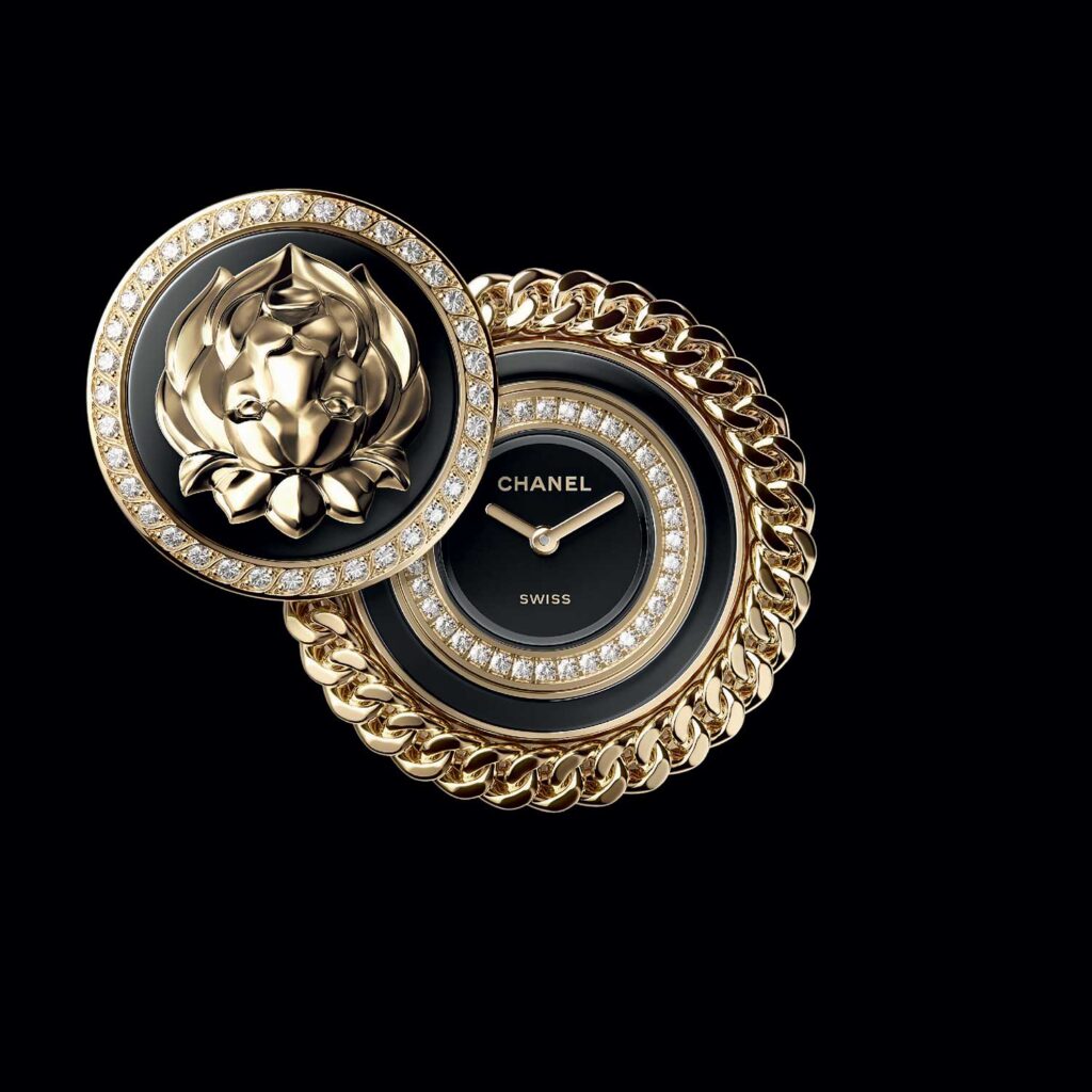 Chanel continúa perfeccionando una de sus especialidades más distintivas: los relojes ocultos. Este año, el protagonismo recae en el Mademoiselle Privé Bouton Lion, una pieza que rinde homenaje al león, símbolo emblemático de la maison.