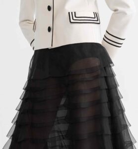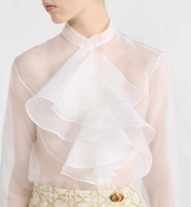 Blusa con cuello con volantes: Confeccionada en organza de seda color crudo y negra. Presenta una silueta diáfana que se distinguen por el cuello con volantes y el cierre abotonado en la parte delantera. La pieza da el toque couture necesario a cualquier look.