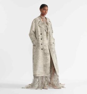 Abrigo: Mezcla de algodón, mohair y lana Dior Barocco beige. Este abrigo de botonadura doble, muestra el motivo Dior Barocco, inspirado en el tema insignia de la colección con flores, mariposas y delicados arabescos. Se ha confeccionado en una mezcla de algodón, mohair y lana beige y presenta una silueta de corte regular realzada con dos bolsillos laterales. La elegante pieza aportará un toque de refinamiento a cualquier conjunto.