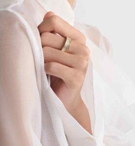 Anillo Dior Night Code: Elaborado en metal dorado, cristales blancos y lacado blanco. La joya ofrece una estética moderna y refinada. El diseño de metal dorado muestra delicados y brillantes cristales blancos engastados, y la firma Christian Dior adorna el lacado blanco. Dior recomienda combinarlo con otras creaciones Dior Night Code.