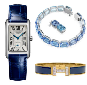 Las joyas y los relojes de temporada también se alinean con la elección cromática. Veamos algunos ejemplos a continuación. El primer es un reloj de la firma Vacheron Constantin cuya correa se encuentra teñida en color azul, la segunda, las diversas joyas de la colección Millenia de Swarovski. La marca relojera Longines también cuenta con un guardatiempo en línea con el azul cerúleo. Nos referimos al modelo Dolcevita. Las agujas del reloj, así como la correa del mismo son de color azul. Y para cerrar las opciones de complementos está este brazalete de Hermès Clic H con diamantes en la hebilla.