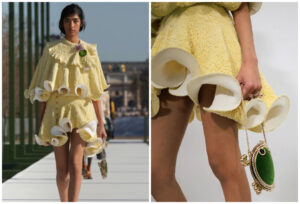 Aunque la colección se encuentra pensada para los meses más fríos del año, Dior apuesta por looks luminosos, con la presencia de siluetas clásicas reinterpretadas con mucha más fluidez. Propone chaquetas Bar menos rígidas, tejidos ondulantes y vestidos vaporosos. La entrega igualmente incluye piezas como pantalones con cortes relajados, que aparecen combinados con abrigos de líneas limpias. En cuanto a colores, la colección la paleta es natural, hay verdor. Verde, obviamente en distintas tonalidades, que coexisten con amarillo, rosa, blanco, negro y gris.
