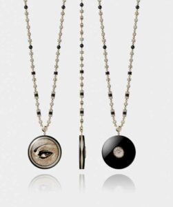 El ojo que todo lo ve representado en el medallón del collar amuleto Protect me de Chanel. La mirada penetrante de Mademoisselle Chanel se refleja en la cara adversa del medallón, elaborado con esmalte “Grand Feu” y rodeado por un engaste de nieve de diamantes blancos y marrones de talla brillante. La cadena de este amuleto está elaborada en oro, con piedras preciosas como el diamante y el ónice.