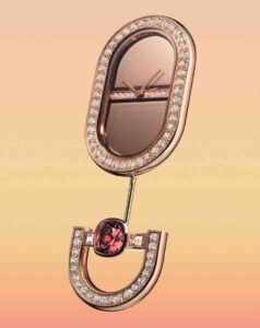La pantera, símbolo por excelencia de la casa Cartier, es el centro de un reloj colgante que celebra el poderoso universo creativo de la firma. El leiv motiv de este reloj es el ágata; la piedra preciosa con la que está hecha el medallón ligeramente cóncavo. En el centro, se ubica una misteriosa esfera con dos manecillas que parecen flotar en la nada. Una pieza poderosa en donde el equilibrio y la tensión juegan de forma constante.