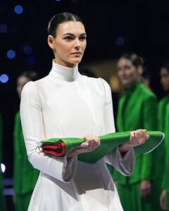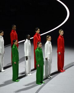 Durante la ceremonia sesenta modelos aparecieron luciendo elegantes trajes monocromáticos de Giorgio Armani, creados en los tres colores de la bandera italiana. De igual forma, fue la modelo Vittoria Ceretti, el rostro de la más reciente campaña de la marca, quien apareció llevando la bandera de guardia de honor. Lució igualmente un diseño color blanco de la misma firma.