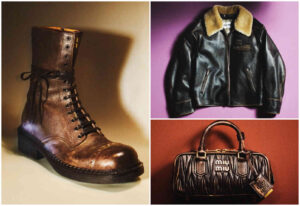 Miu Miu cuenta con infinidad de productos con cuero vintage. Podemos mencionar algunos mocasines clásicos, así como diversos modelos de botas Chelsea, botas con hebillas y agujetas. De igual manera, hay bolsos Arcadie, chaquetas estilo aviador, micro shorts y muchas piezas más. Por medio de las redes sociales Miu Miu colgó la campaña y también colocó algunas de sus piezas envejecidas.