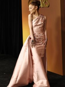 Ariana Grande: Decantó por un vestido de archivo de la firma Dior del año 2027. Elaborado en su momento por John Galliano, con escote asimético, drapeados y pedrería.