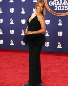 Karol G, por ejemplo, fue de las celebridades mejor vestidas de la noche. La artista colombiana para asistir al evento que premia a lo más destacado de la música latina decantó, eligiendo tendencias de temporada. Optó por un glamoroso vestido negro, de escote profundo en forma de V, brillantes, lentejuelas y plumas como adorno a la altura de la cadera, aportando textura y movimiento de alta costura.
