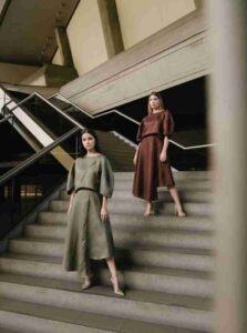 La cápsula “Caminos” está compuesta por vestidos y conjuntos, confeccionados en varios de los textiles que forman parte de la identidad de la diseñadora: Denim, lino, piqué de algodón y terciopelo.