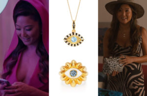 Emily en París Temporada 5: Mindy con un anillo de oro NeverNoT y un collar de ojos con la leyenda «Vida en color» en los episodios 3 y 5.