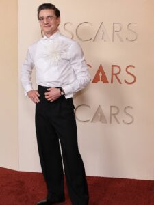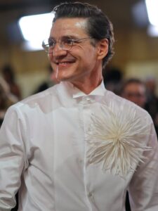Pascal lució un conjunto personalizado hecho a la medida por el director creativo de la firma Matthieu Blazy: camisa de esmoquin sin chaqueta con un broche floral en forma de estrella. El accesorio fue confeccionado en plumas y seda. Además, vistió un pantalón negro que hacía un perfecto contraste con la parte superior. Visiblemente feliz con su look, Pascal a través de sus redes sociales colgó algunas fotografías de las piezas creadas por Chanel para él.