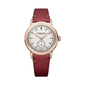 5.Reloj Raymond Weil: Modelo Millesime Automatic Small Seconds Diamonds, de pequeño tamaño, con diamantes en su interior y oro rosa. Lo acompaña una correa de cuero en color rojo.