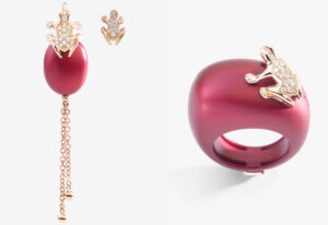 3. Anillo y pendiente asimétricos Dada Arrigoni: El set Dada, artesanía italiana en su máxima expresión. Dos joyas que se distinguen por la contemporaneidad de sus diseños, esta vez, en un apasionado color mezclado con oro y diamantes.