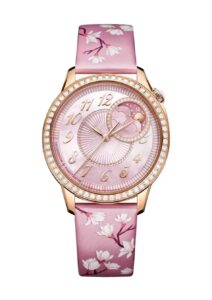 El modelo de complicación lunar destaca por su calibre de manufactura 1088 L, se sitúa entre la 1 y las 3, engastada en un círculo de 36 diamantes talla brillante y enmarcada por una subesfera de oro de 18 quilates. Su corona está engastada delicadamente con una piedra lunar. Aunque estos características resultan atractivas y definen su estructura, la novedad del modelo es su correa: de becerro rosa, pintada a mano con un delicado motivo floral de primavera.