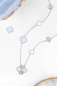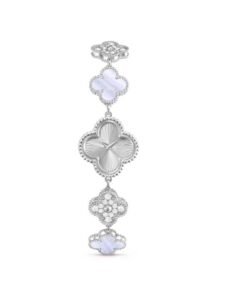 Una de las piezas de esta colección es este collar transformable creado en oro blanco de 18K chapado en rodio guilloché, calcedonia y nácar blanco. La otra pieza destacada de la línea es el reloj Sweet Alhambra en oro blanco de 18 quilates, calcedonia y diamantes que luce perfectamente bien con un anillo con las mismas características del guardatiempo.
