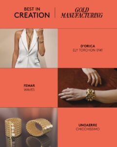 Hasta el momento la cuenta de IG de Vicenzaoro ha develado una de las piezas finalistas. Se trata del anillo Hypnose Galaxy de Cammilli Firenze. La joya inspirada en los sinuosos movimientos del agua, luce un diseño escultural y distintivo. Amplias espirales y formas envolventes se entrelazan en un hipnótico juego de volúmenes, realzado por la combinación de dos tonos dorados y un sofisticado pavé de diamantes naturales.